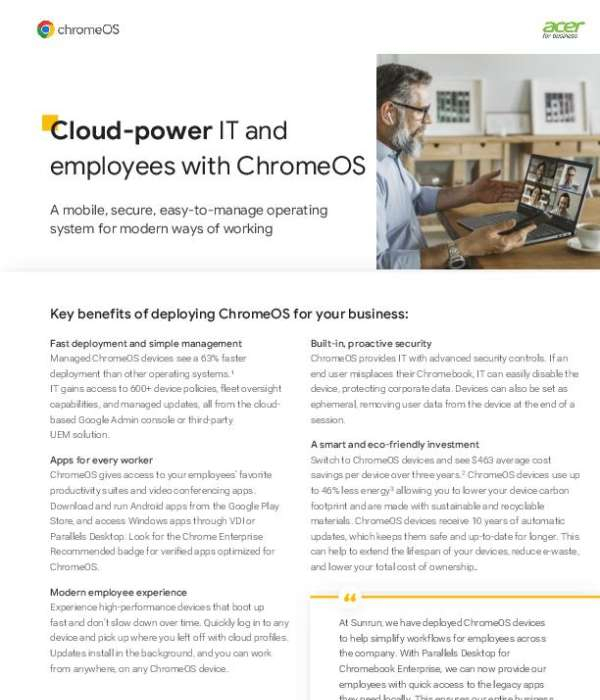 The solution brief, "Do More Than You Thought You Could with Chromebook Plus," illustrates how Acer devices equipped with ChromeOS enhance productivity through powerful processors, efficient multitasking, and seamless integration of cloud tools. Learn how this solution can elevate your team's output and contact Computer Age Electronics to discuss incorporating Acer Chromebooks into your business.