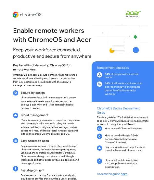 The case study, "Enable Remote Workers with ChromeOS and Acer," details how these devices support remote teams with built-in security features, remote management capabilities through the Google Admin console, and efficient cloud-based tools. Download the case study and connect with Computer Age Electronics for expert guidance on deploying these solutions.