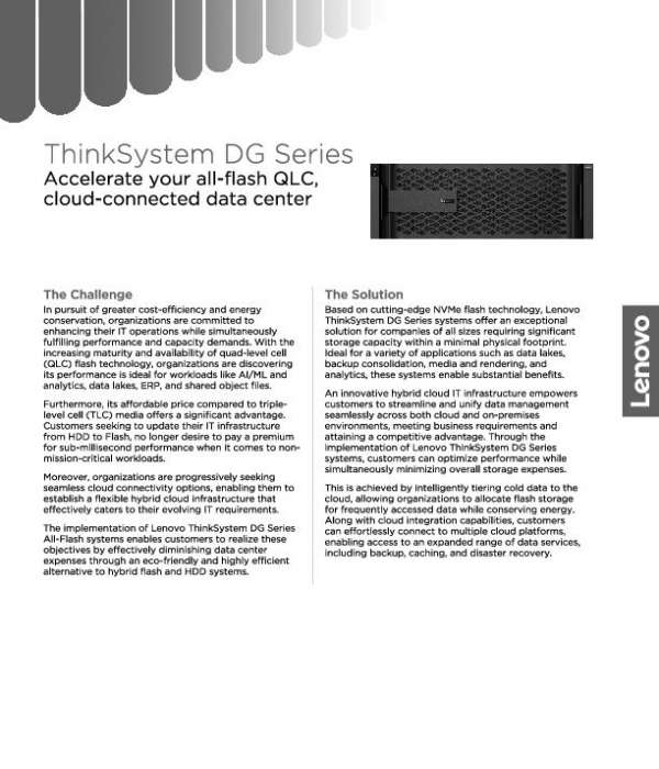 The Lenovo US ThinkSystem DG Series lets you optimize performance, minimize storage costs, and seamlessly manage data across various environments.