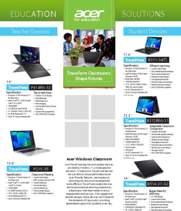 Choosing the right classroom devices means balancing performance, durability, and ease of management. This datasheet provides a detailed look at Acer TravelMate laptops built for education, including teacher and student models that offer features like spill-resistant keyboards, reinforced designs, and AI-enhanced tools. Download to see the specs and reach out to Computer Age Electronics for support in selecting the best options for your school.