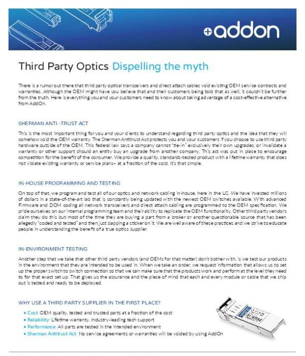 Tired of customers hesitating because they've "heard" third-party optics void OEM warranties? Here's your response. This brief dispels the myth by referencing the Sherman Antitrust Act, which protects your customers' right to choose third-party components. It also reinforces the technical credibility of AddOn's solutions, with all parts tested in real OEM environments, and firmware coded in-house to meet spec. Download and use this to educate customers and your sales team: AddOn's solutions will lower costs and raise performance.