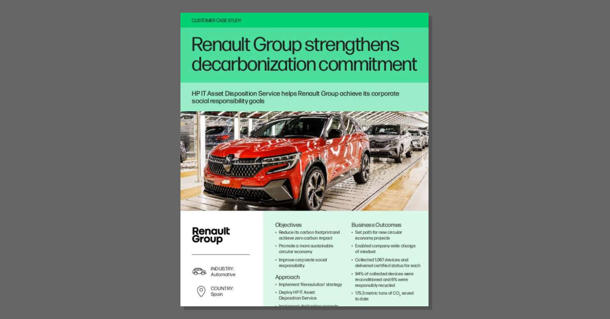 Corporate sustainability strategies demand action. This customer story shows how Renault Group used the HP IT Asset Disposition Service to meet carbon-reduction goals, reduce waste, and streamline IT operations. Read the story to discover how the program enabled the company to recondition nearly all retired devices, saving the equivalent CO₂ of more than 2,900 trees that normally takes 10 years to grow. Contact Computer Age Electronics to discuss how HP Renew can help you achieve your sustainability goals.