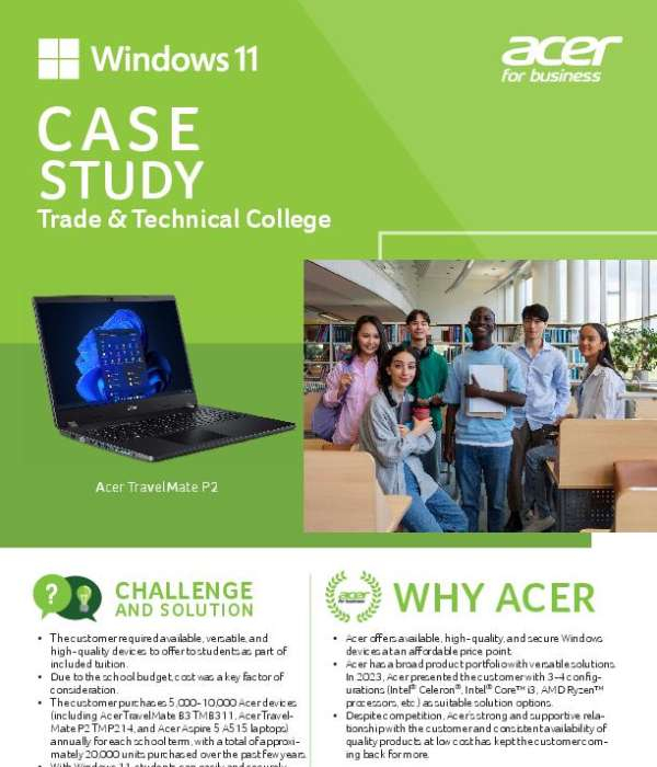 Budget pressure and the need for reliable, student-ready tech can put trade and technical colleges in a bind. This case study shows how one institution solved that problem by deploying thousands of Acer TravelMate laptops each year as part of tuition. The study explores how affordability, availability, and versatility made Acer the long-term provider of choice. Read the case study to learn how your organization can offer secure, cost-effective devices and contact Computer Age Electronics for a customized device consultation.