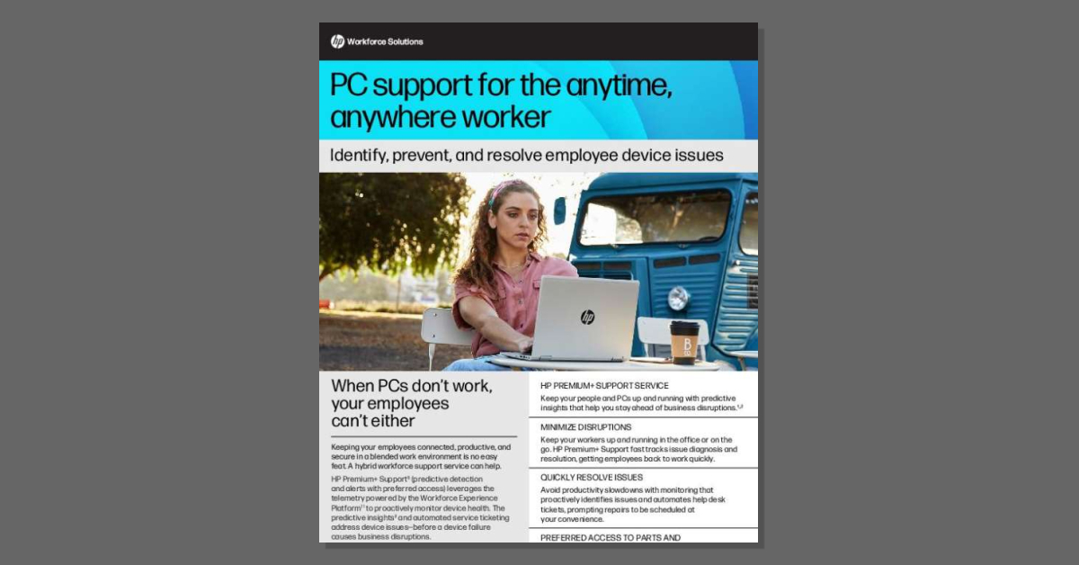 Today's hybrid employees can't afford downtime. The solution brief, "PC Support for the Anytime, Anywhere Worker," shows how HP Premium + Support delivers fast, predictive, and flexible service to prevent disruptions and resolve issues from anywhere. Download the solution brief to see how HP keeps your teams connected and contact Computer Age Electronics to discuss Premium + Support options tailored to your business.