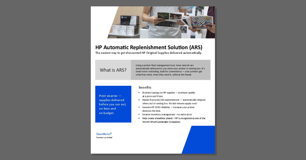 Managing supplies reactively leads to overspending, unexpected downtime, and waste. This datasheet outlines how HP ARS solves those issues by automatically delivering discounted HP Original Supplies when devices run low. Download the ARS datasheet to explore these advantages and contact Computer Age Electronics to talk with an expert about implementing ARS for your business.