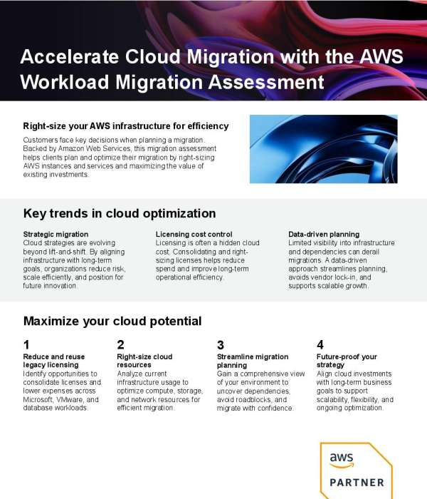 Cloud migration success depends on visibility, cost control, and long-term planning. The one-pager "Accelerate Cloud Migration with the AWS Workload Migration Assessment" outlines how an AWS-backed assessment helps organizations uncover application dependencies, right-size cloud resources, and reduce licensing costs across existing environments. Download the one-pager to see how a data-driven assessment supports confident AWS migrations and scalable cloud strategies, then contact Computer Age Electronics to discuss next steps.