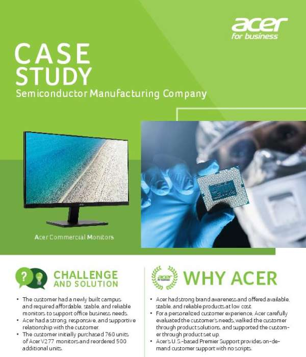 When a global semiconductor manufacturer built a new campus, it required monitors that combined quality, reliability, and affordability — backed by strong service and support. This customer story shows how Acer's focus on dependability, brand strength, and hands-on service helps enterprises equip their teams with confidence. Read the story and contact Computer Age Electronics to learn how Acer monitors and Premier Support can help your customers' businesses run efficiently and cost-effectively.