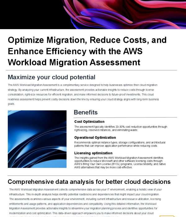 Hidden dependencies and unclear licensing can derail cloud migrations and inflate costs. The solution brief, "Optimize Migration, Reduce Costs, and Enhance Efficiency with the AWS Workload Migration Assessment," outlines how a comprehensive assessment collects data across your IT environment to identify roadblocks, optimize resources, and uncover cost-saving opportunities. Download the solution brief to understand what's really in your environment, then reach out to Computer Age Electronics to discuss how to plan a migration that fits your business.